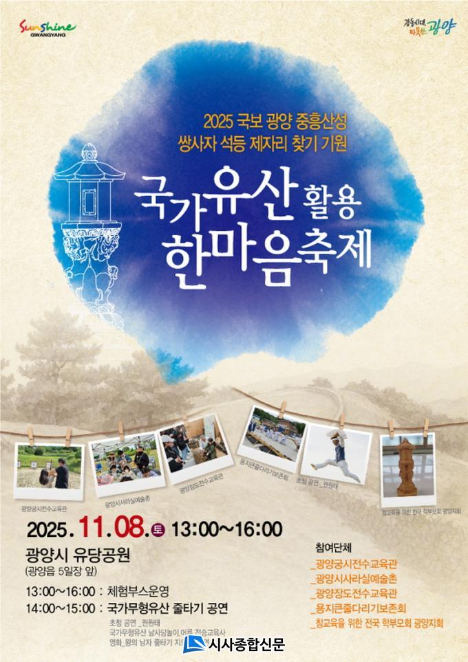 ±è¸í´ö ¹®È¿¹¼ú°úÀåÀº ¡°À̹ø ±¹°¡À¯»ê Ȱ¿ë ÇѸ¶À½ ÃàÁ¦´Â ½Ã¹Î°ú ÇÔ²² ±¤¾çÀÇ ±¹°¡À¯»êÀÌ Áö´Ñ °¡Ä¡¸¦ µÇ»õ±â°í, ½Ö»çÀÚ ¼®µî Á¦ÀÚ¸® ã±âÀÇ Àǹ̸¦ °øÀ¯ÇÏ´Â ¶æ±íÀº ÀÚ¸®¡±¶ó¸ç ¡°¾ÕÀ¸·Îµµ Áö¿ªÀÇ ¹®ÈÀ¯»êÀ» Ȱ¿ëÇÑ ´Ù¾çÇÑ ÇÁ·Î±×·¥À» ÅëÇØ ±¤¾çÀÇ ¿ª»ç¿Í ¹®È¸¦ ³Î¸® ¾Ë¸®°Ú´Ù¡±°í ¸»Çß´Ù.