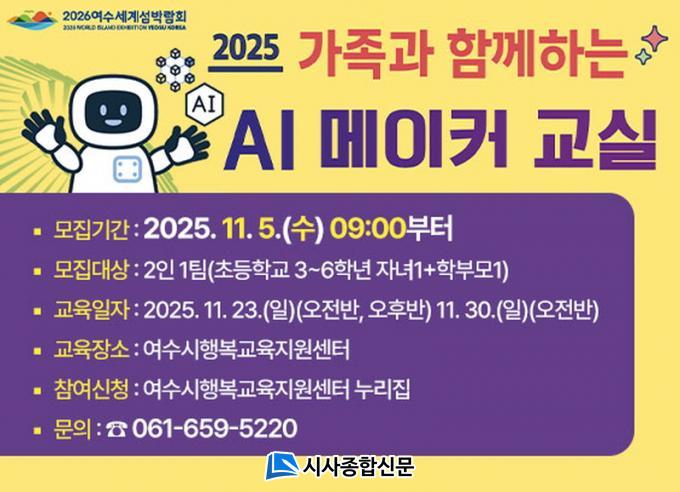 | ¿©¼ö½Ã, ¡®°¡Á·°ú ÇÔ²²ÇÏ´Â AI ¸ÞÀÌÄ¿ ±³½Ç¡¯ Âü¿©ÀÚ ¸ðÁý ÃʵîÇлý¡¤Çкθð ´ë»ó 2ÀÎ 1ÆÀ AI âÀÛ ±³À°¡¦ 11¿ù 23ÀϺÎÅÍ ¿î¿µ |