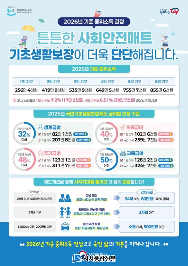 2026³â ±âÁØ ÁßÀ§¼ÒµæÀº 4ÀÎ °¡±¸ ±âÁØÀ¸·Î ¿ÃÇØ 609¸¸ 7,773¿ø¿¡¼ 6.51% ÀλóµÈ 649¸¸ 4,738¿øÀ¸·Î °áÁ¤µÆ´Ù. ¿ª´ë ÃÖ°í ¼öÁØÀÇ ÀλóÀ²ÀÌ´Ù. »ý°è±Þ¿©´Â 1ÀÎ °¡±¸ ±âÁØ ÃÖ´ë 82¸¸ 556¿ø, 4ÀÎ °¡±¸´Â ÃÖ´ë 207¸¸ 8,316¿øÀ¸·Î °¢°¢ 5¸¸ 5,000¿ø¡¤12¸¸ 7,000¿øÀÌ ÀλóµÈ´Ù.
