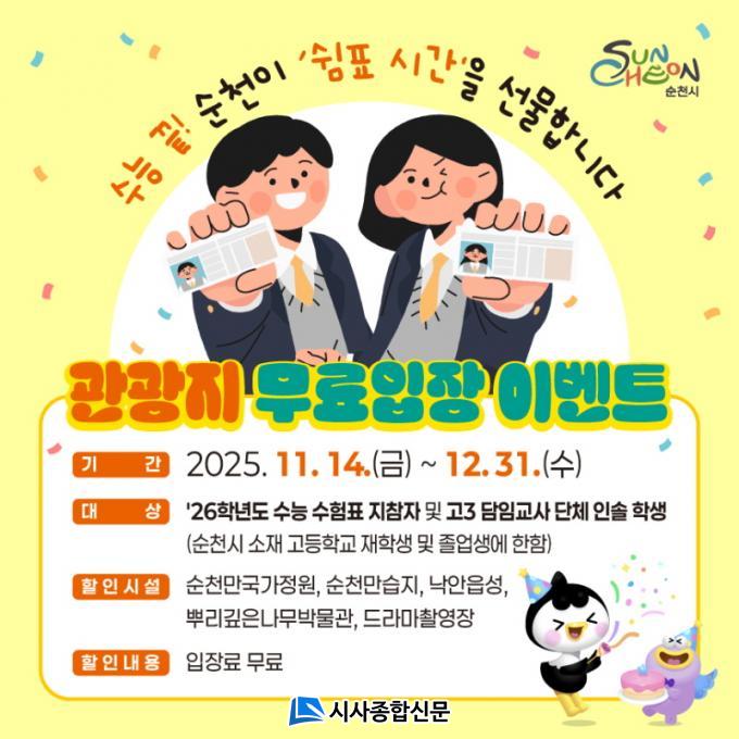 [½Ã»çÁ¾ÇսŹ® = Àå¹Î±Ô ±âÀÚ] ¼øÃµ½Ã(½ÃÀå ³ë°ü±Ô)´Â 2026Çг⵵ ´ëÇмöÇдɷ½ÃÇèÀ» ¸¶Ä£ ¼öÇè»ýµéÀÌ ½ÃÇèÀÇ ±ä ¿©Á¤À» ¸¶¹«¸®Çϰí Àá½Ã ¼ûÀ» °í¸¦ ¼ö ÀÖµµ·Ï, 11¿ù 14ÀϺÎÅÍ 12¿ù 31ÀϱîÁö ÁÖ¿ä °ü±¤Áö¸¦ ¹«·á·Î °³¹æÇÑ´Ù.