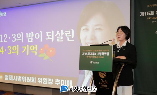 Ãß¹Ì¾Ö À§¿øÀåÀº ¡®Á¦ÁÖ4¡¤3 Áø½Ç±Ô¸íÀÇ Àǹ̡¯¸¦ ÁÖÁ¦·Î, ¡°Á¦ÁÖ 4¡¤3 ÇØ°áÀÇ °¡Àå Å« °É¸²µ¹Àº ¿À·£ ¼¼¿ù À̾îÁø »ö±ò·ÐÀ̾ú´Ù¡±¸ç, ¡°4¡¤3¿¡ ¾º¿öÁø ³«ÀÎ ÇÁ·¹ÀÓÀ» ¡®¿¬´ëÀÇ Èû¡¯À¸·Î ³Ñ¾î¼¹´Ù¡±°í °Á¶Çß´Ù. ¶ÇÇÑ ¡°Á¦ÁÖ4¡¤3ÀÇ Áø½ÇÀ» Áö۰í, ±× ±³ÈÆÀ» ´ÙÀ½ ¼¼´ë¿¡ ÀüÇÏ¸ç ´Ù½Ã´Â ±¹°¡Æø·ÂÀÌ ½Ã¹ÎÀ» Áþ¹â´Â ÀÏÀÌ ¾ø¾î¾ß ÇÑ´Ù¡±°í ¸»Çß´Ù.