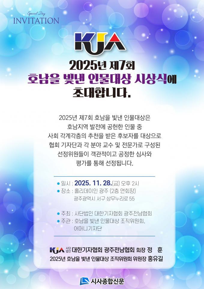 ÇÑÆí, ¡®Á¦7ȸ È£³²À» ºû³½ Àι°´ë»ó¡¯ ½Ã»ó½ÄÀº ¿À´Â 11¿ù 28ÀÏ(±Ý) ¿ÀÈÄ 2½Ã, ±¤Áֽà ¼±¸ Ä¡Æòµ¿ Ȧ¸®µ¥ÀÌ ÀÎ ±¤ÁÖÈ£ÅÚ 2Ãþ ¿¬È¸Àå¿¡¼ ¿¸°´Ù. À̹ø Çà»ç´Â »ç´Ü¹ýÀÎ ´ëÇѱâÀÚÇùȸ ±¤ÁÖ¡¤Àü³²Çùȸ(ȸÀå Á¤ÈÆ)°¡ ÁÖÃÖÇϰí, 2025³â È£³²À» ºû³½ Àι°´ë»ó Á¶Á÷À§¿øÈ¸(À§¿øÀå È«À¯±æ)¿Í ¾î¸Ó´Ï±âÀÚ´Ü(´ÜÀå ¾ç¸íÈñ)ÀÌ ÁÖ°üÇÑ´Ù.
