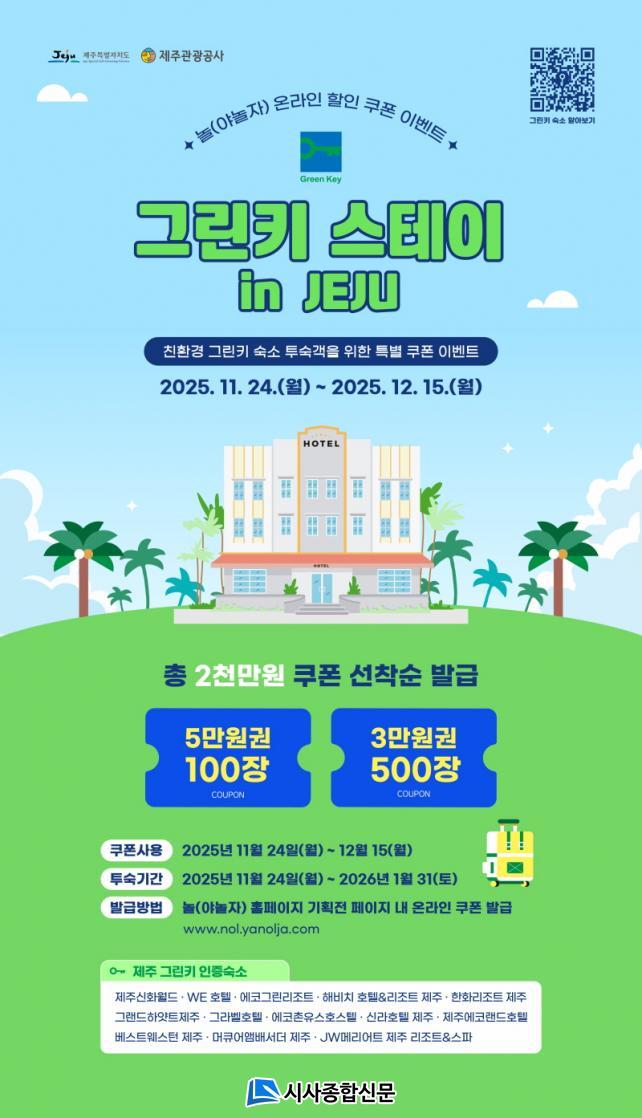 À̹ø À̺¥Æ®´Â ±×¸°Å° ÀÎÁõ ¼÷¼ÒÀÇ È«º¸ °È¿Í ´õºÒ¾î Á¦ÁÖ¸¦ ã´Â ¿©Çà°´µéÀÌ º¸´Ù ½±°Ô ģȯ°æ ¼÷¼Ò¸¦ ÀÌ¿ëÇÒ ¼ö ÀÖµµ·Ï ÆíÀǸ¦ Á¦°øÇϱâ À§ÇØ ÃßÁøÇÏ´Â °¡¿îµ¥ µµ¿Í °ø»ç´Â ±¹³» ´ëÇ¥ OTA(¿Â¶óÀÎ ¿©Çà»ç) Ç÷§ÆûÀÎ ¡®³î(www.nol.yanolja.com)¡¯À» ÅëÇØ ÃÑ 2,000¸¸¿ø ±Ô¸ðÀÇ ¼÷¹Ú ÇÒÀÎ ÄíÆùÀ» ¼±Âø¼øÀ¸·Î Á¦°øÇÏ´Â ¡®±×¸°Å° ½ºÅ×ÀÌ in JEJU¡¯ ±âȹÀüÀ» ÁøÇàÇÒ ¿¹Á¤ÀÌ´Ù. ÇÒÀÎ ´ë»óÀº Á¦ÁÖÁö¿ª ±×¸°Å° ÀÎÁõ ¼÷¼Ò·Î ÇÑÁ¤µÇ¸ç, Åõ¼÷ °¡´É ±â°£Àº 2026³â 1¿ù 31ÀϱîÁö´Ù.