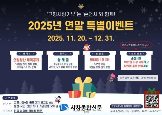 [½Ã»çÁ¾ÇսŹ® = Àå¹Î±Ô ±âÀÚ] ¼øÃµ½Ã(½ÃÀå ³ë°ü±Ô)°¡ ¿¬¸»À» ¸Â¾Æ °íÇâ»ç¶û±âºÎÁ¦ Ȱ¼ºÈ¿Í ¿¬¸»Á¤»ê ÇýÅÃÀ» À§ÇØ 11¿ù 20ÀϺÎÅÍ 12¿ù 31ÀϱîÁö ¡®°íÇâ»ç¶û±âºÎÁ¦ ¿¬¸» Ưº°À̺¥Æ®¡¯¸¦ ½Ç½ÃÇÑ´Ù°í ¹àÇû´Ù.