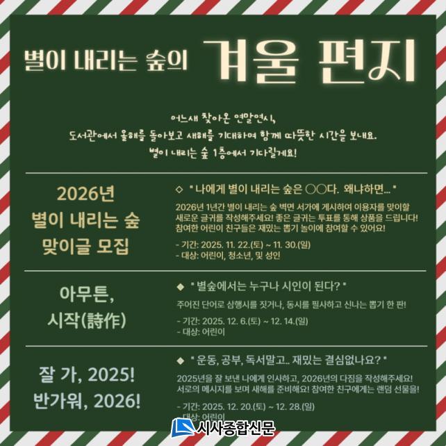 Áö³ 22ÀϺÎÅÍ ¿À´Â 30ÀϱîÁö ÁøÇàµÇ´Â ¡®2026³â º°ÀÌ ³»¸®´Â ½£ ¸ÂÀÌ±Û ¸ðÁý¡¯¿¡¼´Â ³»³â ÇÑ ÇØ µµ¼°ü ³»ºÎ º®¸é ¼°¡¿¡ °Ô½ÃÇÒ ±Û±Í¸¦ °ø¸ðÇϸç, ÀÌ¿ëÀÚ ¼±È£µµ ÅõÇ¥·Î ¿ì¼öÀÛÀ» ¼±Á¤ÇØ ¼ÒÁ¤ÀÇ »óǰÀ» ÁõÁ¤ÇÏ°í ¾î¸°ÀÌ´Â »Ì±â ³îÀ̵µ Áñ±æ ¼ö ÀÖ´Ù.