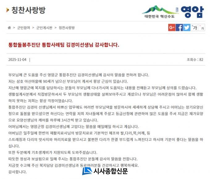 ¿ÃÇØ 1¿ùºÎÅÍ´Â ¿µ¾Ï±ºÀÌ »ç·Ê°ü¸® ´ë»óÀ¸·Î ÁöÁ¤ÇØ, ¹Ø¹ÝÂù Áö¿øÀ» ½ÃÀÛÀ¸·Î Àå±â¿ä¾ç¼ºñ½º, ±º¹Î ´©±¸³ª µ¹º½ µ¿Çà ¼ºñ½º¸¦ Æ÷ÇÔÇØ °æÁ¦¡¤°Ç°¡¤µ¹º½ µî ºÐ¾ß·Î ³ª´² °ü¸®ÇØ ¿À°í ÀÖ´Ù. ƯÈ÷, ÅëÇÕ»ç·Ê°ü¸®»çÀÇ °³ÀÔ ÀÌÈÄ °¡Á¤ÀÌ Ã³ÇÑ º¹ÇÕ ¹®Á¦¸¦ Áö¿ª»çȸ¿Í ÇÔ²² Ç®¾î ±âÃÊ»ýȰ¼ö±ÞÀÚ·Î ¼±Á¤Çß´Ù.
