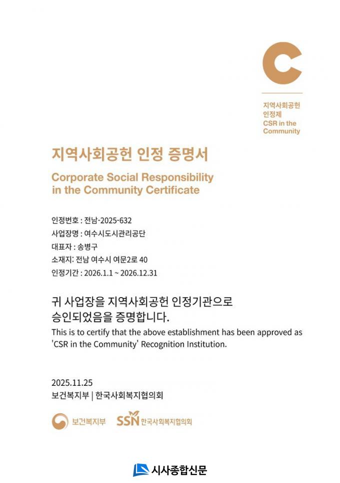 [½Ã»çÁ¾ÇսŹ® = ¿À½ÂÅà ±âÀÚ] ¿©¼ö½Ãµµ½Ã°ü¸®°ø´Ü(ÀÌ»çÀå ¼Ûº´±¸)Àº º¸°Çº¹ÁöºÎ¿Í Çѱ¹»çȸº¹ÁöÇùÀÇȸ°¡ °øµ¿ ÁÖ°üÇÏ´Â ¡®2025³â Áö¿ª»çȸ°øÇå ÀÎÁ¤Á¦¡¯¿¡¼ ÃÖ°íµî±ÞÀÎ Sµî±ÞÀ» ȹµæÇϸç 4³â ¿¬¼Ó Áö¿ª»çȸ°øÇå ÀÎÁ¤±â°üÀ¸·Î ¼±Á¤µÆ´Ù°í 26ÀÏ ¹àÇû´Ù.