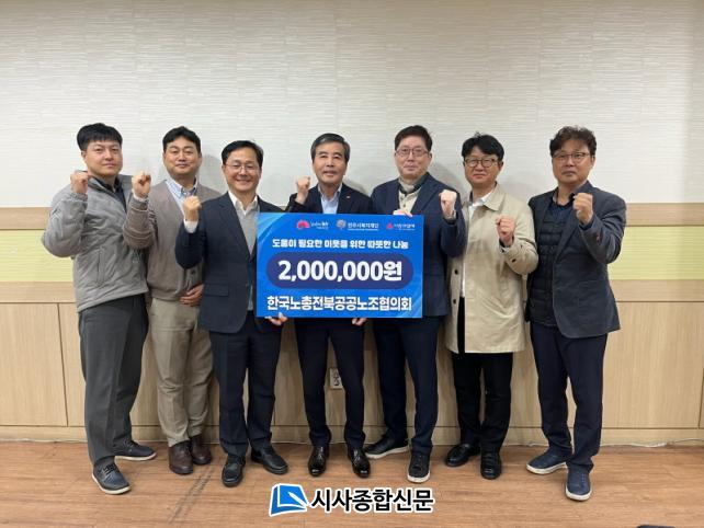 ÀüºÏ°ø°ø³ëµ¿Á¶ÇÕÇùÀÇȸ´Â ¼Ò¼Ó À§¿øÀå 6¸íÀÌ Âü¼®ÇÑ À̳¯ Àü´Þ½Ä¿¡¼ Áö¿ª ³» ¼Ò¿ÜµÈ ÀÌ¿ôÀ» µ½±â À§ÇÑ ¼º±Ý 200¸¸ ¿øÀ» ±âŹÇß´Ù.