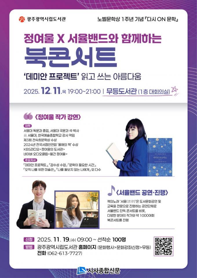 ¿À´Â 11ÀÏ ¿ÀÈÄ 7½Ã ¹«µîµµ¼°ü ´ëȸÀǽǿ¡¼´Â ¡®´Ù½Ã ¿Â(ON) ¹®ÇС¯À» ÁÖÁ¦·Î ºÏÄܼƮ°¡ ¿¸°´Ù. Á¤¿©¿ï ÀÛ°¡ÀÇ Ã¥¸¸³²(ºÏÅäÅ©)°ú ¼À²¹êµåÀÇ ¶óÀÌºê °ø¿¬ÀÌ ÇÔ²² ÁøÇàµÇ¸ç, ÇѰ ÀÛ°¡ÀÇ ÀÛǰÀ» »õ·Ó°Ô ÇØ¼®ÇÏ°í ±× ±íÀ̸¦ ÇÔ²² ´À²¸º¸´Â ½Ã°£À» Á¦°øÇÑ´Ù.