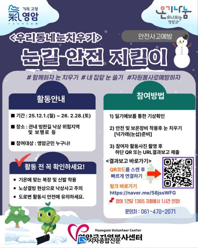 À̹ø Ȱµ¿Àº Æø¼³·Î ÀÎÇÑ º¸ÇàÀÚ ³«»ó»ç°í À§ÇèÀ» ÁÙÀ̱â À§ÇÑ °ÍÀ¸·Î, °ü³» º¸Çà·Î¡¤°ñ¸ñ±æ¡¤°æ»ç·Î µî ºùÆÇ Ãë¾à±¸°£À» Áß½ÉÀ¸·Î ºñ´ë¸é ¹æ½ÄÀÇ ´« Ä¡¿ì±â Ȱµ¿ÀÌ ÁøÇàµÈ´Ù. Âü¿© Èñ¸ÁÀÚ´Â Æø¼³ ÈÄ ÀÚÀ²ÀûÀ¸·Î Á¦¼³È°µ¿À» ½Ç½ÃÇÑ µÚ, Ȱµ¿»çÁø°ú °á°úº¸°í¸¦ ¿Â¶óÀÎÀ¸·Î Á¦ÃâÇϸé 1365ÀÚ¿øºÀ»çÆ÷ÅÐ ±âÁØ 1½Ã°£ÀÇ ºÀ»ç½Ã°£ÀÌ ÀÎÁ¤µÈ´Ù.