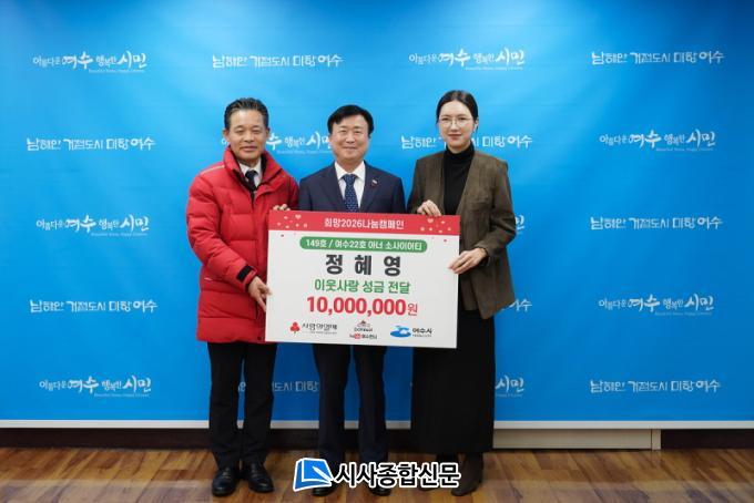 [½Ã»çÁ¾ÇսŹ® = ¿À½ÂÅà ±âÀÚ] ¿©¼ö½Ã´Â ¿©¼ö22È£(Àü³² 149È£) ¾Æ³Ê Á¤Çý¿µ À¯Æ©¹ö(¿©¼ö¾ð´Ï)°¡ Áö³ 11ÀÏ °ü³» Àú¼Òµæ ÇѺθð°¡Á¤À» Áö¿øÇϱâ À§ÇØ Èñ¸Á2026³ª´®Ä·ÆäÀÎ ¼º±Ý 1õ¸¸ ¿øÀ» ±âŹÇß´Ù°í ¹àÇû´Ù.