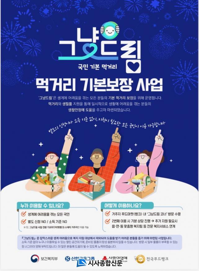 15ÀÏ ÀÍ»ê½Ã¿¡ µû¸£¸é Á¤ºÎ°¡ »õ·Î µµÀÔÇÏ´Â '±×³Éµå¸²' »ç¾÷Àº °©ÀÛ½º·¯¿î »ý°è À§±â³ª Áúº´, ½ÇÁ÷ µîÀ¸·Î ½Ä·áǰ Áö¿øÀÌ ÇÊ¿äÇÑ ½Ã¹Î¿¡°Ô Áï½Ã ½Ä·áǰÀ» Á¦°øÇÏ´Â ±¹°¡ Â÷¿øÀÇ º¹Áö º¸Àå Á¤Ã¥ÀÌ´Ù. Áö¿ø ÀýÂ÷¸¦ °£¼ÒÈÇØ Á¢±Ù¼ºÀ» ³ôÀÎ °ÍÀÌ Æ¯Â¡ÀÌ´Ù.