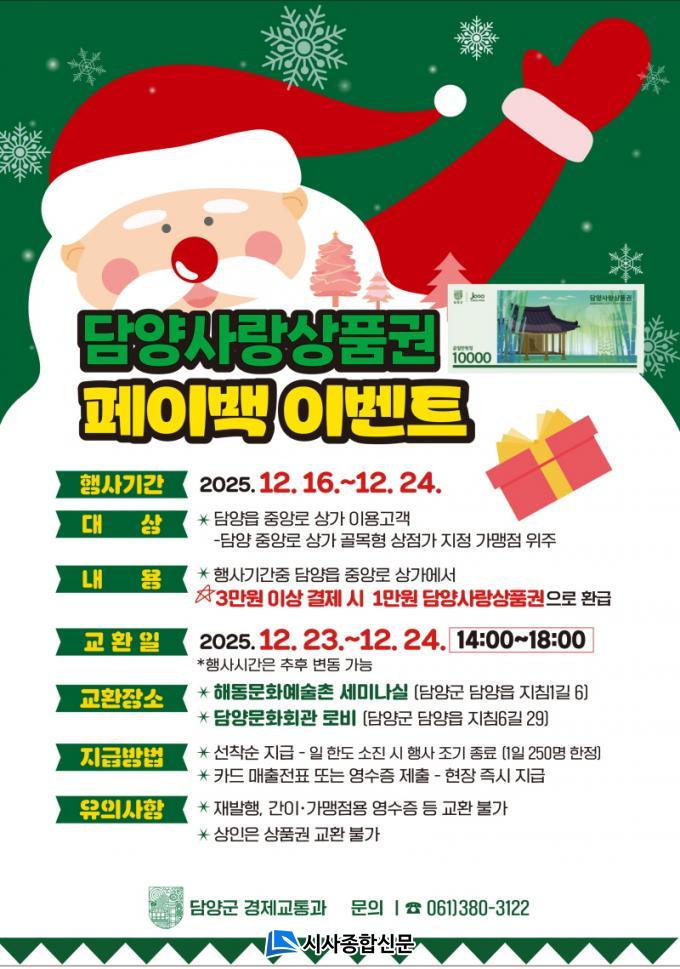 [½Ã»çÁ¾ÇսŹ® = ¿À½ÂÅà ±âÀÚ] ´ã¾ç±º(±º¼ö Á¤Ã¶¿ø)Àº ¿¬¸» ¼Òºñ ÁøÀÛ°ú Áö¿ª »ó±Ç Ȱ¼ºÈ­¸¦ À§ÇØ 12¿ù 23ÀϺÎÅÍ 25ÀϱîÁö ´ã¾çÀ¾ Áß¾Ó·Î¿Í ´ã¾ç½ÃÀå ÀÏ¿ø¿¡¼­ ¡®´ã¾ç»ç¶û»óǰ±Ç ÆäÀ̹é Çà»ç¡¯¸¦ ¿î¿µÇÑ´Ù.