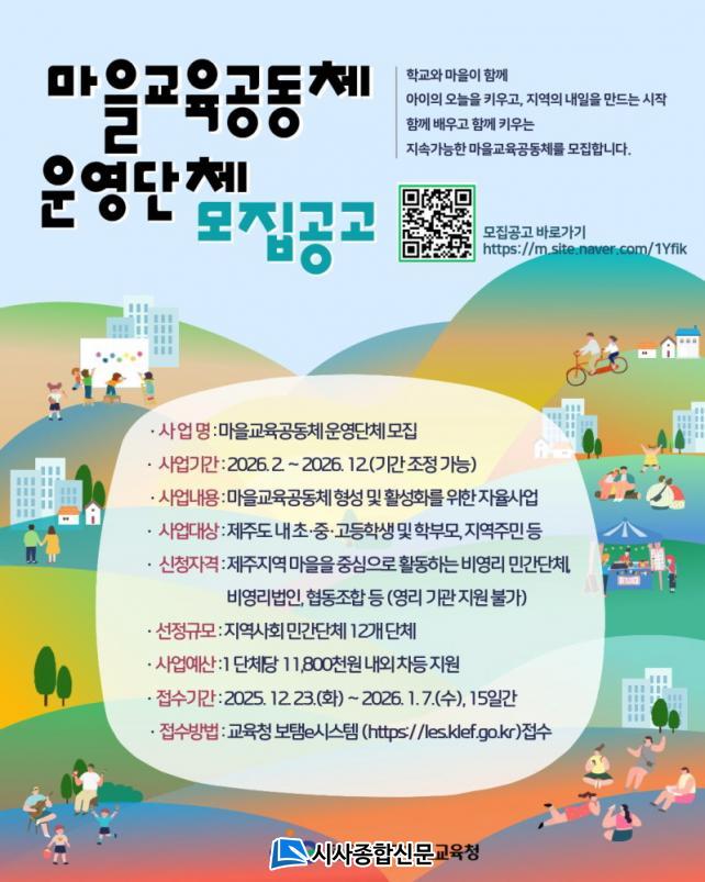 [½Ã»çÁ¾ÇսŹ® = °í¼º¹Î ±âÀÚ] Á¦ÁÖÆ¯º°ÀÚÄ¡µµ±³À°Ã»Àº Çб³¿Í ¸¶À»ÀÌ ÇÔ²² ¾ÆÀ̵éÀÇ ¹è¿ò°ú ¼ºÀåÀ» µ½´Â¡®2026³â ¸¶À»±³À°°øµ¿Ã¼ ¿î¿µ´Üü¡¯ 12°÷À» °ø°³ ¸ðÁýÇÑ´Ù°í 29ÀÏ ¹àÇû´Ù.