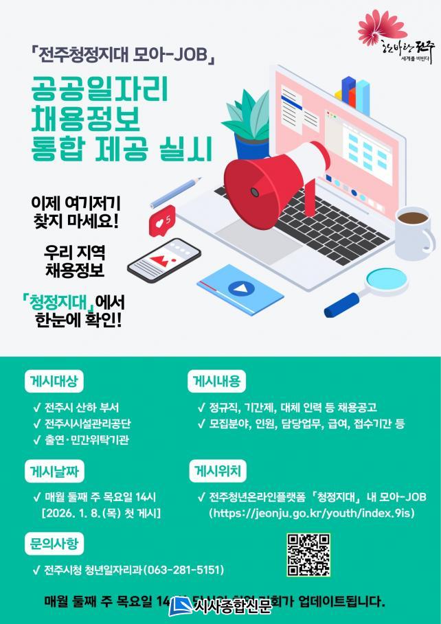 ÀÌ¿¡ ½Ã´Â ºÐ»êµÈ °¢ ±â°üº° ä¿ë°ø°í¸¦ ÃëÇÕ¡¤Á¤¸® ÈÄ ¿À´Â 8ÀϺÎÅÍ ¸Å¿ù µÑ° ÁÖ ¸ñ¿äÀÏ ¿ÀÈÄ 2½Ã, ÀüÁÖû³â¿Â¶óÀÎÇ÷§Æû ¡®Ã»Á¤Áö´ë¡¯(youth.jeonju.go.kr) ³» ¡®¸ð¾Æ-JOB¡¯ °Ô½ÃÆÇ¿¡ °Ô½ÃÇÔÀ¸·Î½á ±¸Á÷Ȱµ¿¿¡ ¾î·Á¿òÀ» °Þ´Â û³âµéÀÌ °ø°øºÎ¹® ä¿ë Á¤º¸¸¦ ½±°í ºü¸£°Ô È®ÀÎÇÒ ¼ö ÀÖµµ·Ï Áö¿øÇÒ °èȹÀÌ´Ù.