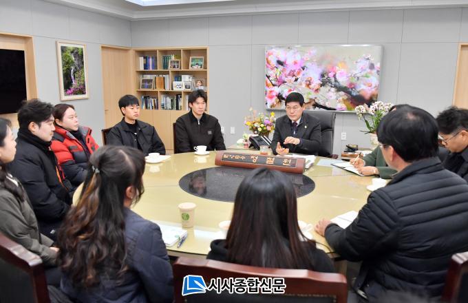 [½Ã»çÁ¾ÇսŹ® = ¿À½ÂÅà ±âÀÚ] ´ã¾ç±º(±º¼ö Á¤Ã¶¿ø)Àº Áö³ 5ÀÏ ´ã¾ç±ºÃ» ¼Ò¼â¿ø½Ç¿¡¼ Áö¿ª ³ó¾÷ÀÇ ¹Ì·¡¸¦ À̲ø¾î°¥ û³â ³ó¾÷Àΰú ³ó¾÷»ç°üÇб³ Á¹¾÷»ýµéÀÌ Âü¼®ÇÑ °¡¿îµ¥, ÇöÀåÀÇ ¸ñ¼Ò¸®¸¦ Á÷Á¢ µè°í ¹ßÀü ¹æ¾ÈÀ» ¸ð»öÇϱâ À§ÇÑ ¡®Ã»³â ³ó¾÷ÀÎ ¼ÒÅë °£´ãȸ¡¯¸¦ °³ÃÖÇß´Ù.