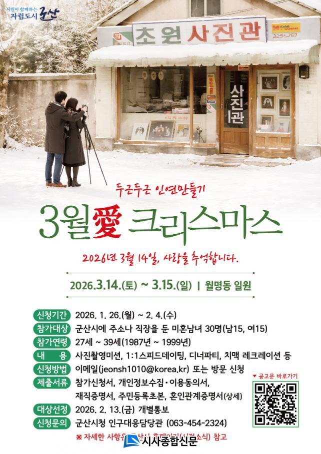 2026³â ûÃá³²³àÀÇ °¡½¿À» µÎ±Ù°Å¸®°Ô ÇÒ ¡®3¿ùäñ Å©¸®½º¸¶½º¡¯´Â 3¿ù 14ÀϺÎÅÍ 15ÀϱîÁö 1¹Ú 2ÀÏ ÀÏÁ¤À¸·Î ÁøÇàµÈ´Ù. Çà»çÀå¼Ò´Â ¿ù¸íµ¿ ÀÏ¿øÀ¸·Î, Âü°¡ÀÚµéÀº À̰÷¿¡¼ 1:1 ½ºÇǵ嵥ÀÌÆÃ¡¤ÆÀ Æ÷Åä¹Ì¼Ç¡¤¿¬¾ÖƯ° µî ´Ùä·Î¿î ÇÁ·Î±×·¥À» ÇÔ²²ÇÒ ¿¹Á¤ÀÌ´Ù.