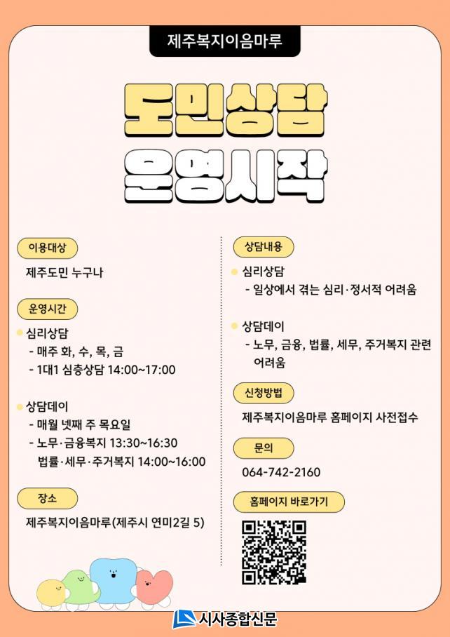 Á¦ÁÖº¹ÁöÀÌÀ½¸¶·çÀÇ »ó´ã »ç¾÷Àº µµ¹ÎÀÌ »ýȰ ¼Ó¿¡¼ °Þ´Â ´Ù¾çÇÑ ¹®Á¦¸¦ º¸´Ù ½±°Ô »ó´ã¹Þ°í ÇÊ¿äÇÑ Á¤º¸¸¦ Àû½Ã¿¡ Á¦°ø¹ÞÀ» ¼ö ÀÖµµ·Ï ¸¶·ÃµÇ¾ú´Ù. ƯÈ÷ 2026³âºÎÅÍ´Â ±âÁ¸ »ó´ã ºÐ¾ß¿¡ ´õÇØ ¡®±ÝÀ¶º¹Áö¡¯ ºÐ¾ß°¡ »õ·Ó°Ô Ãß°¡µÇ¾î °æÁ¦Àû ¾î·Á¿ò°ú À繫 °ü·Ã °í¹Î±îÁö º¸´Ù Æø³Ð°Ô Áö¿øÇÒ ¼ö ÀÖ´Â ±â¹ÝÀ» °ÈÇß´Ù.