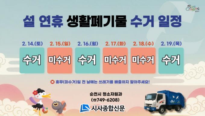 ¼³ ¿¬ÈÞ ±â°£ Á¾·®Á¦ ¹× ÀçȰ¿ë, À½½Ä¹°¾²·¹±â µî »ýȰÆó±â¹°Àº 14Àϰú 16ÀÏ¿¡ Á¤»óÀûÀ¸·Î ¼ö°ÅµÈ´Ù. ´Ù¸¸, ¼³³¯ ´çÀÏÀÎ 17ÀÏ È¿äÀϰú 18ÀÏ ¼ö¿äÀÏÀº ¼ö°ÅÇÏÁö ¾Ê´Â´Ù. ¼ö°ÅÇÏÁö ¾Ê´Â Àü³¯Àº ¹èÃâ ÀÚÁ¦¸¦ ´çºÎÇß´Ù.