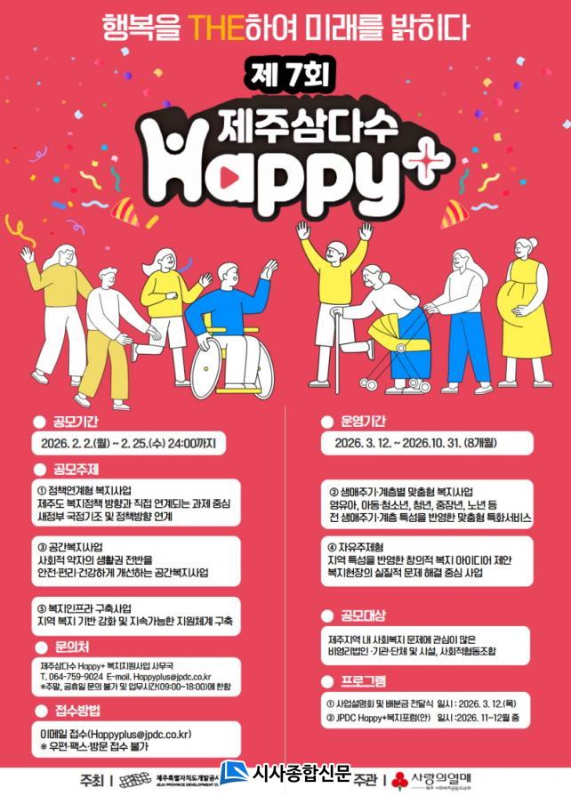 Âü¿©¸¦ Èñ¸ÁÇÏ´Â ´Üü´Â ¿À´Â 2¿ù 25ÀϱîÁö Á¦ÁÖ°³¹ß°ø»ç ȨÆäÀÌÁö(www.jpdc.co.kr), Á¦ÁÖ»çȸº¹Áö°øµ¿¸ð±Ýȸ ȨÆäÀÌÁö(https://jeju.chest.or.kr/base.do)¿¡¼ ½Åû ¼·ù¸¦ ³»·Á¹Þ¾Æ ÀÛ¼º ÈÄ À̸ÞÀÏ(happyplus@jpdc.co.kr)·Î Á¦ÃâÇÏ¸é µÈ´Ù. ÀÚ¼¼ÇÑ »çÇ×Àº Á¦ÁÖ»ï´Ù¼ö Happy+º¹Áö °ø¸ð»ç¾÷ »ç¾÷±¹(064-759-9024)À» ÅëÇØ ¹®ÀÇÇÒ ¼ö ÀÖ´Ù.