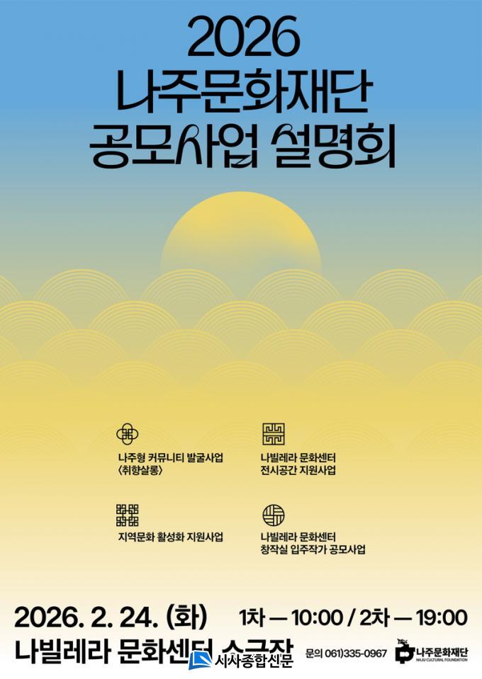 ³ªÁÖ¹®ÈÀç´ÜÀº ¿À´Â 2¿ù 24ÀÏ ³ªºô·¹¶ó¹®È¼¾ÅÍ ¼Ò±ØÀå¿¡¼ ¡®2026³â ³ªÁÖ¹®ÈÀç´Ü ÅëÇÕ °ø¸ð»ç¾÷¼³¸íȸ¡¯¸¦ ¿¬´Ù°í 13ÀÏ ¹àÇû´Ù. À̹ø ¼³¸íȸ´Â Áö¿ª¹Î°ú ¿¹¼úÀÎÀ» ´ë»óÀ¸·Î Àç´ÜÀÇ ¿¬Áß »ç¾÷À» Á¾ÇÕÀûÀ¸·Î ¾È³»ÇÏ°í °ø¸ð»ç¾÷ Âü¿©¸¦ µ¶·ÁÇϱâ À§ÇØ ¸¶·ÃÇß´Ù.