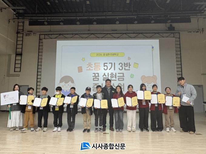 ¾Æ¿ï·¯, ¼ö·á½Ä¿¡¼´Â Á¤¼ºÈ£ ±âºÎÀÚ(¿ëÈ£ÁÖ½Äȸ»ç ´ëÇ¥)°¡ ²Þ µ¿¹ÝÀÚ·Î Âü¿©ÇØ Çлýµé¿¡°Ô ¡®²Þ ½ÇÇö±Ý¡¯ Áõ¼¸¦ ¼ö¿©Çß´Ù. Á¤ ´ëÇ¥´Â ¡°ÀÌ ±âºÎ±ÝÀÌ ¾ÆÀ̵éÀÌ ¿Á¤À» °®°í µµÀüÇÒ ¼ö ÀÖ´Â ¸¶Áß¹°ÀÌ µÇ±æ ¹Ù¶õ´Ù¡±¸ç ÀÀ¿øÀÇ ¶æÀ» ¹àÇû´Ù.