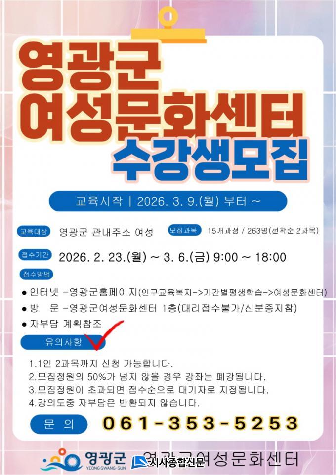 ÇÑÆí, 2026³â »ó¹Ý±â ¿©¼º¹®È¼¾ÅÍ ÇÁ·Î±×·¥Àº 3¿ù 6ÀϺÎÅÍ ¼øÂ÷ÀûÀ¸·Î °³°ÇÒ ¿¹Á¤À̸ç, °Áº° ¼¼ºÎ ÀÏÁ¤ µî ÀÚ¼¼ÇÑ »çÇ×Àº ¿µ±¤±º ȨÆäÀÌÁö ¶Ç´Â ¿µ±¤±º ¿©¼º¹®È¼¾ÅÍ(¢Ï353-5253), ¿µ±¤±º °¡Á¤Çູ°ú(¢Ï350-5547)¿¡¼ È®ÀÎÇÒ ¼ö ÀÖ´Ù.