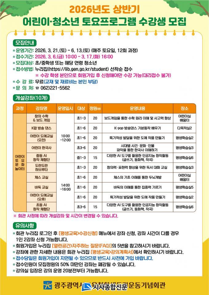 ¾î¸°ÀÌ¡¤Ã»¼Ò³â Åä¿äÇÁ·Î±×·¥Àº ¡ã¾î¸°ÀÌ Çѱ¹»ç ¡ãâÀǼöÇÐ&º¸µå°ÔÀÓ ¡ãAIâÀÛ Ã¼Çè´Ü µî 10°³°¡ °³¼³µÅ ¿À´Â 3¿ù 21ÀϺÎÅÍ 6¿ù 13ÀϱîÁö ¸ÅÁÖ Åä¿äÀÏ 2½Ã°£¾¿ ÃÑ 12ȸ ÁøÇàµÈ´Ù.