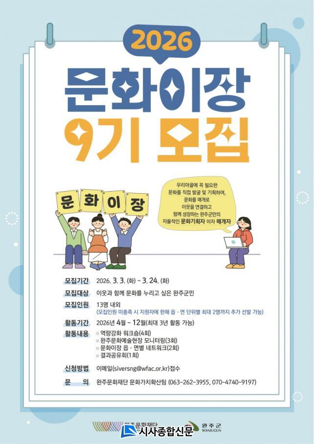 ¸ðÁý ±â°£Àº 2026³â 3¿ù 3ÀϺÎÅÍ 3¿ù 24ÀϱîÁöÀ̸ç, ÀÌ¿ô°ú ÇÔ²² ¹®È¸¦ ´©¸®°í ½ÍÀº ¿ÏÁÖ±º¹ÎÀ̶ó¸é ´©±¸³ª ½ÅûÇÒ ¼ö ÀÖ´Ù.¡¸¹®ÈÀÌÀå 9±â ¸ðÁý¡¹°ú °ü·ÃµÈ ±âŸ ÀÚ¼¼ÇÑ ³»¿ëÀº ¿ÏÁÖ¹®ÈÀç´Ü ȨÆäÀÌÁö(http://www.wfac.or.kr)¿¡¼ È®ÀÎ °¡´ÉÇÏ´Ù.