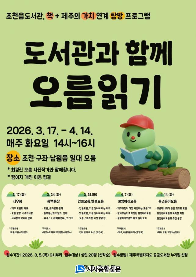 Âü°¡ÀÚµéÀº Á¦ÁÖ ¿À¸§ÀÇ ¿ª»ç¸¦ ºñ·ÔÇØ ¿À¸§°ú °ùÀÚ¿ÐÀÇ °ü°è, ¿À¸§ÀÇ ÁöÁú°ú ÁÖº¯ dz°æÀ» ¹è¿ì°í ½º¸¶Æ®ÆùÀ¸·Î ¿À¸§ »çÁøÀ» ÃÔ¿µÇÏ´Â ¹æ¹ýµµ ÀÍÈú ¼ö ÀÖ´Ù. ÇÁ·Î±×·¥ Âü¿©¸¦ ¿øÇÏ´Â ½Ã¹ÎµéÀº 3¿ù 5ÀϺÎÅÍ Á¦ÁÖÆ¯º°ÀÚÄ¡µµ °ø°øµµ¼°ü ´©¸®Áý(https://www.jeju.go.kr/lib)¢¡ ÇÁ·Î±×·¥¢¡ »çÀü ½Åû ¸Þ´º¸¦ ÅëÇØ ½ÅûÇÒ ¼ö ÀÖ´Ù.