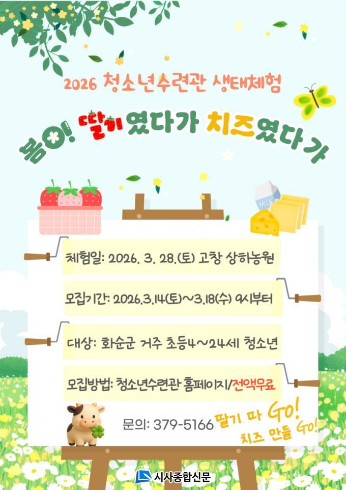 ½Åû ±â°£Àº 3¿ù 14ÀÏ(Åä)ºÎÅÍ 3¿ù 18ÀÏ(¼ö)±îÁöÀ̸ç, ȼø±º¿¡ ÁÖ¼Ò¸¦ µÐ ÃʵîÇб³ 4Çгâ ÀÌ»ó 24¼¼ ÀÌÇÏ Ã»¼Ò³âÀÌ¸é ´©±¸³ª ½ÅûÇÒ ¼ö ÀÖ´Ù. ȼø±ºÃ»¼Ò³â¼ö·Ã°ü ȨÆäÀÌÁö(https://hwasunyouth.kr) ÇÁ·Î±×·¥ ½Åû °Ô½ÃÆÇÀ» ÅëÇØ ½Åû °¡´ÉÇϸç, ÃÖÁ¾ Âü¿©ÀÚ´Â °³º° ¹®ÀÚ·Î ¾È³»ÇÒ ¿¹Á¤ÀÌ´Ù.