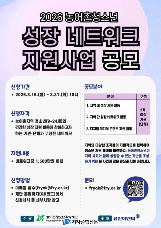 ¡®2026 ³ó¾îÃÌû¼Ò³â ¼ºÀå ³×Æ®¿öÅ© Áö¿ø»ç¾÷¡¯Àº Áö¿ª ³» ´Ù¾çÇÑ ±â°ü°ú ´Üü°¡ ÀÚ¹ßÀûÀ¸·Î Çù·ÂÇÏ¿© û¼Ò³â Áö¿øÃ¼°è¸¦ ±¸ÃàÇϰí, û¼Ò³âÀÌ Áö¿ª»çȸ¿Í ÇÔ²² ¼ºÀåÇÒ ¼ö ÀÖ´Â ±â¹ÝÀ» ¸¶·ÃÇϱâ À§ÇØ ÃßÁøµÇ´Â »ç¾÷ÀÌ´Ù.