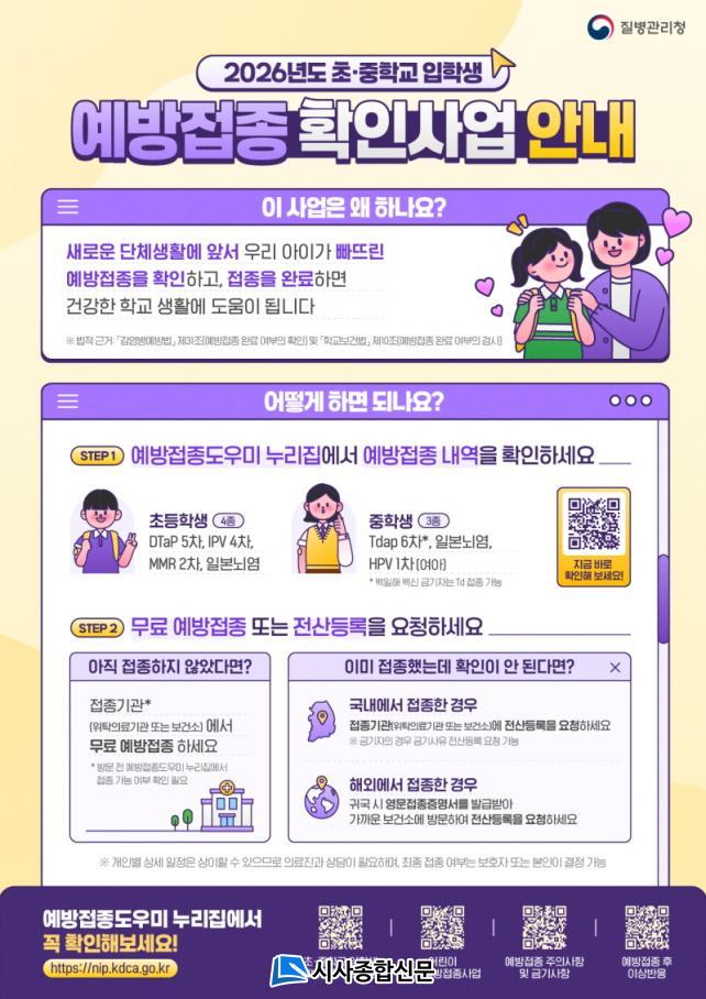 È®ÀÎ Ç׸ñÀº ÃʵîÇб³ ÀÔÇлýÀÇ °æ¿ì ¡ãDTaP 5Â÷ ¡ãIPV 4Â÷ ¡ãMMR 2Â÷ ¡ãÀϺ»³ú¿°À̸ç, ÁßÇб³ ÀÔÇлýÀº ¡ãTdap 6Â÷ ¡ãÀϺ»³ú¿° ¡ãHPV 1Â÷(¿©Çлý ´ë»ó) ¿Ï·á ¿©ºÎ¸¦ È®ÀÎÇÑ´Ù.