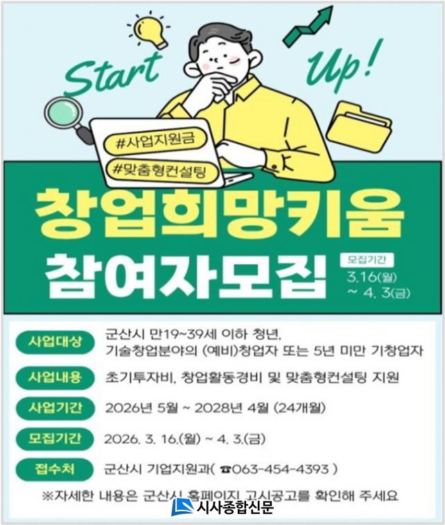 Âü¿© ´ë»óÀº ¸¸19¼¼~¸¸39¼¼ÀÇ ±º»ê½Ã û³âÀ¸·Î, ÀڽŸ¸ÀÇ Ã¢¾÷ ¾ÆÀÌÅÛ°ú ¾ÆÀ̵ð¾î¸¦ °¡Áø »ç¾÷ÀÚµî·ÏÀ» ÇÑ ÀûÀÌ ¾ø´Â ¿¹ºñ â¾÷°¡ ¶Ç´Â 5³â ¹Ì¸¸ÀÇ ±ââ¾÷°¡ÀÌ´Ù. ¸ðÁý ±Ô¸ð´Â 10¸í(ÆÀ)ÀÌ¸ç ½ÅûÀº °³ÀÎÀ̳ª ÆÀ ´ÜÀ§·Î ÇÒ ¼ö ÀÖ´Ù. ¿¹ºñ â¾÷°¡´Â »ç¾÷ ¼±Á¤ ÈÄ 6°³¿ù À̳»¿¡ ±º»ê½Ã¿¡ »ç¾÷ÀÚµî·ÏÀ» ¿Ï·áÇØ¾ß ÇÑ´Ù.