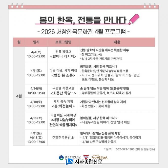 ÇÁ·Î±×·¥ Âü¿© ½ÅûÀº ¼Ã¢ÇÑ¿Á¹®È°ü¿¡ ¹æ¹®Çϰųª ÀüÈ(062-373-4365)¸¦ ÅëÇØ °¡´ÉÇϸç ÇÁ·Î±×·¥º° Àç·áºñ µî ÀϺΠÂü°¡ºñ°¡ ÀÖ´Ù.