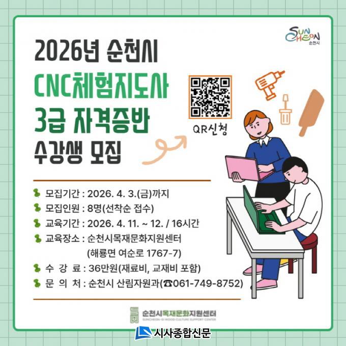 [½Ã»çÁ¾ÇսŹ® = ¿À½ÂÅà ±âÀÚ] ¼øÃµ½Ã´Â ¿À´Â 4¿ù 3ÀϱîÁö ¡®2026³â CNCüÇèÁöµµ»ç 3±Þ ÀÚ°ÝÁõ¹Ý¡¯ ±³À°»ýÀ» ¸ðÁýÇÑ´Ù°í ¹àÇû´Ù.