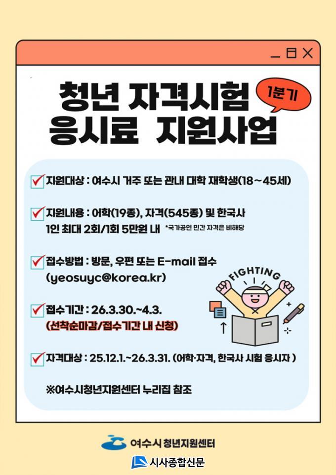 Áö¿ø ´ë»ó ½ÃÇèÀº 2026³â¿¡ ÀÀ½ÃÇÑ ¾îÇÐ 19Á¾(ÅäÀÍ µî)°ú ÀÚ°Ý 545Á¾(±¹°¡±â¼úÀڰݹý ½ÃÇà±ÔÄ¢¿¡ µû¸¥ ÀڰݽÃÇè), Çѱ¹»ç ½ÃÇèÀ̸ç, Áö³ÇØ 12¿ù¿¡ ÀÀ½ÃÇÑ ½ÃÇè(¾îÇС¤ÀÚ°Ý¡¤Çѱ¹»ç)¿¡ ´ëÇØ¼µµ ¼Ò±Þ Áö¿øÀÌ °¡´ÉÇÏ´Ù.
