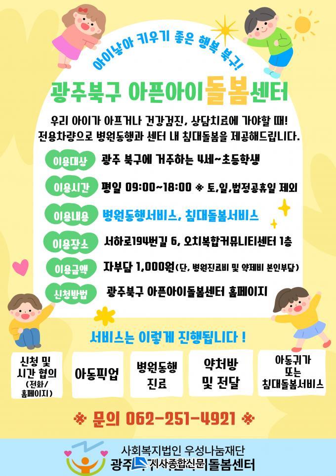 »ç¾÷ ´ë»óÀº ºÏ±¸ °ÅÁÖ ¸¸ 4¼¼~12¼¼ ¾Æµ¿ÀÌ¸ç ¾ÆÇ¾ÆÀÌ µ¹º½¼¾ÅÍ ´©¸®Áý(www.bukguchildcare.or.kr) ¶Ç´Â À¯¼±(¢Ï062-251-4921)À» ÅëÇØ ½ÅûÇÒ ¼ö ÀÖ´Ù.