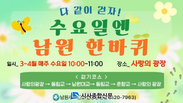 [½Ã»çÁ¾ÇսŹ® = ¿À½ÂÅà ±âÀÚ] ³²¿ø½Ãº¸°Ç¼Ò(¼ÒÀå ÇÑ¿ëÀç)°¡ ½Ã¹ÎÀÇ °Ç° ÁõÁø°ú ÀÏ»ó ¼Ó ¿îµ¿ ½À°ü Çü¼ºÀ» À§ÇØ ¿À´Â 4¿ùºÎÅÍ 11¿ù±îÁö °È±â ½Çõ ÇÁ·Î±×·¥ÀÎ ¡®¼ö¿äÀÏ¿£ ³²¿ø ÇѹÙÄû¡¯¸¦ ¿î¿µÇÑ´Ù.
