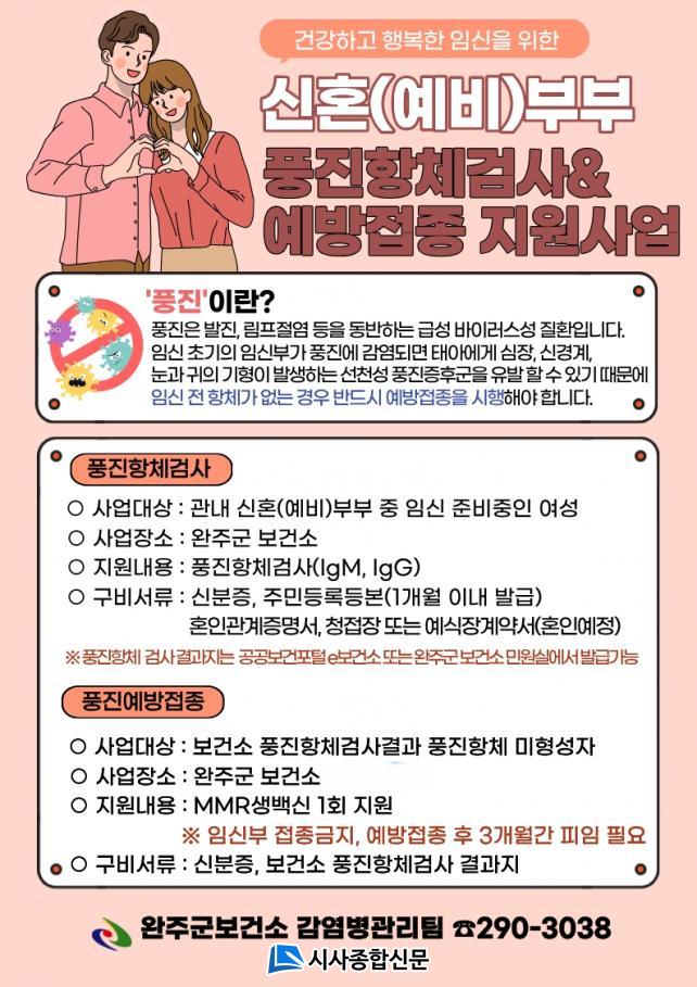 dzÁø ¿¹¹æÁ¢Á¾Áö¿ø »ç¾÷Àº °ü³» ÀÓ½ÅÀ» Áغñ ÁßÀÎ ½ÅÈ¥(¿¹ºñ)ºÎºÎ ¿©¼ºÀ» ´ë»óÀ¸·Î ÁøÇàµÇ¸ç, º¸°Ç¼Ò¿¡¼ dzÁø Ç×ü°Ë»ç(IgM, IgG)¸¦ ¹«·á·Î ¹ÞÀ» ¼ö ÀÖ°í, °Ë»ç °á°ú Ç×ü°¡ ¾ø´Â °æ¿ì¿¡´Â È«¿ª¡¤º¼°Å¸®¡¤Ç³Áø(MMR) ¿¹¹æÁ¢Á¾À» 1ȸ Áö¿øÇÑ´Ù.