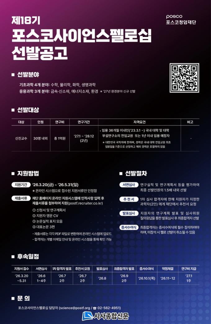 Æ÷½ºÄÚû¾ÏÀç´Ü °ü°èÀÚ´Â ¡°Æ÷½ºÄÚ»çÀÌ¾ð½ºÆç·Î½ÊÀº ±âÃʰúÇкÎÅÍ ÀÀ¿ë°úÇбîÁö Æø³ÐÀº ¿¬±¸ ºÐ¾ß¸¦ Áö¿øÇϸç, ½ÅÁø ¿¬±¸ÀÚµéÀÌ ¾ÈÁ¤ÀûÀ¸·Î ¿¬±¸¿¡ ¸ôÀÔÇÒ ¼ö Àִ ȯ°æÀ» Á¦°øÇÏ´Â µ¥ ¸ñÀûÀÌ ÀÖ´Ù¡±¸ç ¡°Æ¯È÷ ¿ÃÇØ ½Å¼³µÈ ȯ°æ ºÐ¾ß¸¦ ÅëÇØ ±âÈĺ¯È, ÀÚ¿ø¼øÈ¯, ¿À¿° Àú°¨ µî º¹ÇÕÀûÀΠȯ°æ ¹®Á¦ ÇØ°áÀ» À§ÇÑ À¶ÇÕ ¿¬±¸¸¦ Àû±ØÀûÀ¸·Î Áö¿øÇÒ °èȹ¡±À̶ó°í ¹àÇû´Ù.
