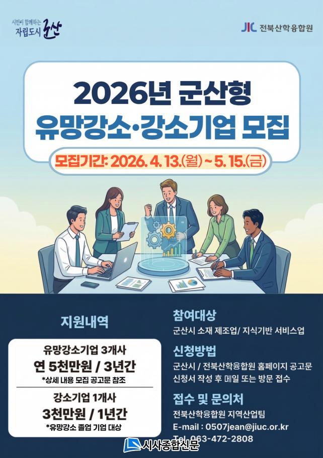 ½ÅûÀº ¿À´Â 5¿ù 13ÀϱîÁöÀ̸ç, ¼·ù ½É»ç¿Í ÇöÀå ½Ç»ç, ¹ßÇ¥ ½É»ç¸¦ °ÅÃÄ ÃÖÁ¾ ¼±Á¤µÈ´Ù. ÀÚ¼¼ÇÑ »çÇ×Àº ±º»ê½Ã ½Å¼ºÀå»ê¾÷°ú(063-454-2745) ¶Ç´Â ÀüºÏ»êÇÐÀ¶ÇÕ¿ø(063-472-2808)À¸·Î ¹®ÀÇÇÏ¸é µÈ´Ù.