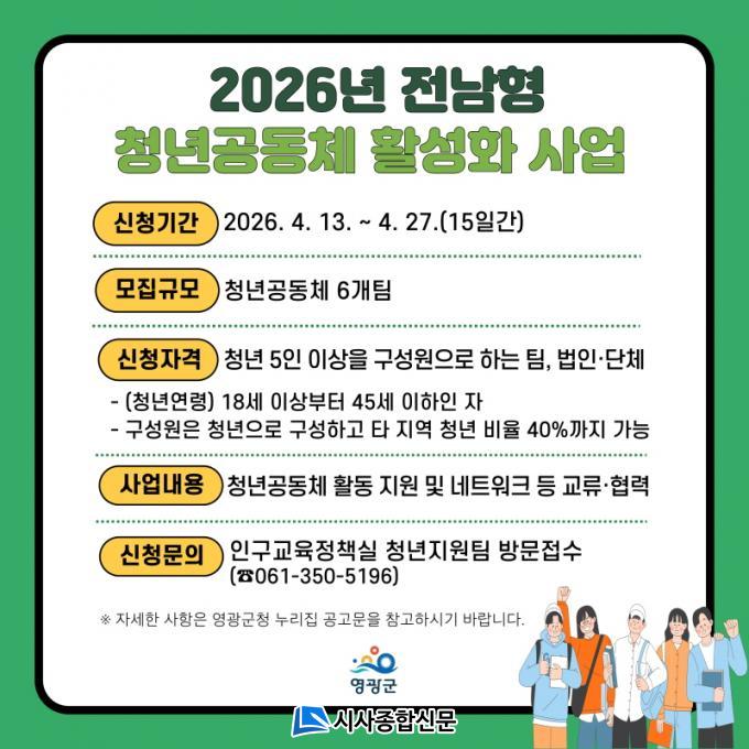 ½Åû ´ë»óÀº û³â 5ÀÎ ÀÌ»óÀ¸·Î ±¸¼ºµÈ ÆÀ¡¤¹ýÀΡ¤´ÜüÀ̸ç, ¸ðÁý ºÐ¾ß´Â ¡ãÁö¿ª¿¬°è ¡ãÀÏÀÚ¸®¡¤Ã¢¾÷ ¡ã¹®È¡¤¿¹¼ú ¡ãºÀ»çȰµ¿ µî 4°³ ºÐ¾ß´Ù. Áö¿ª»çȸ¿¡ »õ·Î¿î Ȱ·ÂÀ» ºÒ¾î³Ö°í ´Ù¾çÇÑ °øµ¿Ã¼ Ȱµ¿À» Èñ¸ÁÇϴ û³âÀ̶ó¸é ´©±¸³ª Âü¿©ÇÒ ¼ö ÀÖ´Ù.