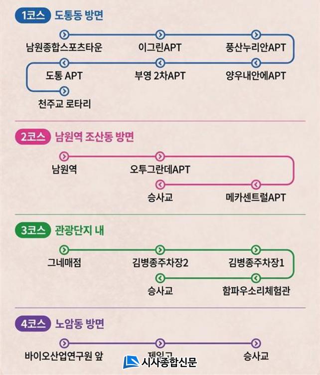 ¹«·á ¼ÅƲ¹ö½º´Â ÃÑ 4°³ ³ë¼±À¸·Î ¿î¿µµÇ¸ç, ±¸Ã¼ÀûÀÎ ±¸°£Àº ¡ã1³ë¼± ³²¿øÁ¾ÇÕ½ºÆ÷Ã÷Ÿ¿î ¡ê õÁÖ±³ ·ÎŸ¸® ¡ã2³ë¼± ³²¿ø¿ª ¡ê ½Â»ç±³ ¡ã3³ë¼± ±×³×¸ÅÁ¡ ¡ê ½Â»ç±³ ¡ã4³ë¼± ³²¿ø¹ÙÀÌ¿À»ê¾÷¿¬±¸¿ø ¡ê ½Â»ç±³ µîÀÌ´Ù. ¿îÇà ½Ã°£Àº ¿ÀÀü 10½ÃºÎÅÍ ¿ÀÈÄ 11½Ã±îÁöÀ̸ç, ¾à 15~30ºÐ °£°ÝÀ¸·Î ¼øÈ¯ ¿îÇàÇÑ´Ù.