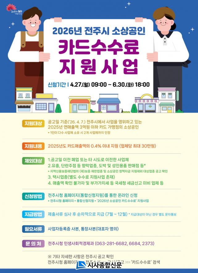 ÀüÁֽô ¿À´Â 27ÀϺÎÅÍ 6¿ù 30ÀϱîÁö ÀüÁֽà ¼Ò»ó°øÀÎÀ» ´ë»óÀ¸·Î 2025³âµµ Ä«µå¸ÅÃâ¾×ÀÇ 0.4% À̳», ¾÷ü´ç 30¸¸ ¿ø±îÁö Áö¿øÇÏ´Â ¡®2026³â ¼Ò»ó°øÀÎ Ä«µå¼ö¼ö·á Áö¿ø»ç¾÷¡¯ ½ÅûÀ» Á¢¼öÇÑ´Ù.