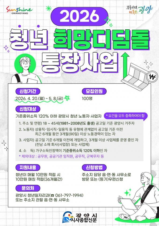 ¡®Ã»³â Èñ¸Áµðµõµ¹ ÅëÀå»ç¾÷¡¯Àº Àü¶ó³²µµ¿Í ±¤¾ç½Ã°¡ °øµ¿À¸·Î ÃßÁøÇÏ´Â µµºñ º¸Á¶»ç¾÷À¸·Î, û³âÀÌ ¸Å¿ù 10¸¸ ¿ø¾¿ 36°³¿ù µ¿¾È Àû¸³Çϸé ÁöÀÚü°¡ °°Àº ±Ý¾×À» Áö¿øÇØ ¸¸±â ½Ã ÃÖ´ë 720¸¸ ¿ø°ú ÀÌÀÚ¸¦ ¹ÞÀ» ¼ö ÀÖ´Ù.